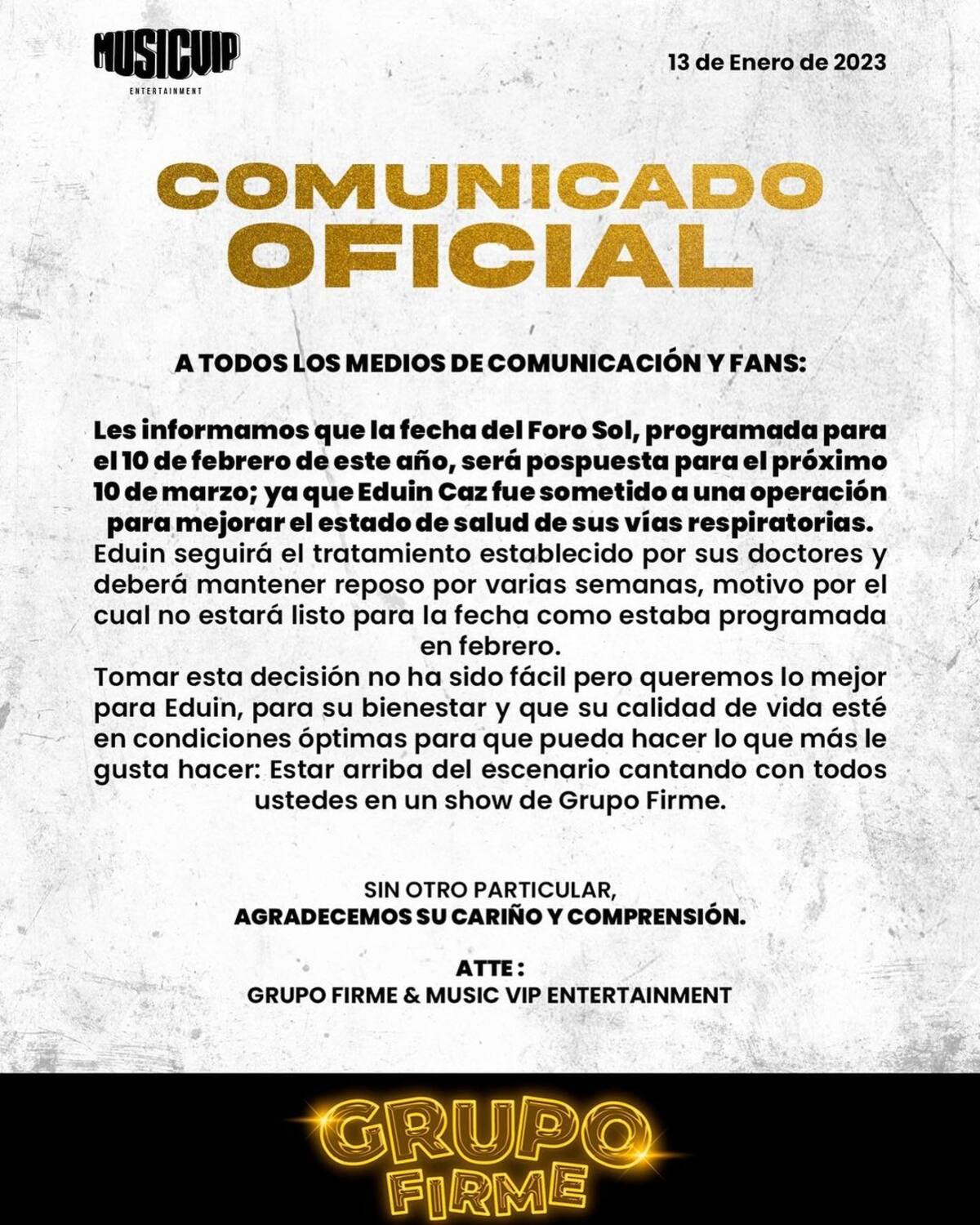 El boletín continúa: "Tomar esta decisión no ha sido fácil pero queremos lo mejor para Eduin, para su bienestar y que su calidad de vida esté en condiciones óptimas para que pueda hacer lo que más le gusta hacer: estar arriba del escenario cantando con todos ustedes en un show de Grupo Firme".