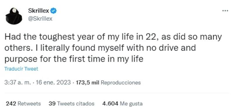 El Dj y productor Skrillex cumplió 35 años el pasado 15 de enero. Un cumpleaños especial, ya que, a través de su cuenta de Twitter, compartió con sus seguidores que vivió un complejo 2022.