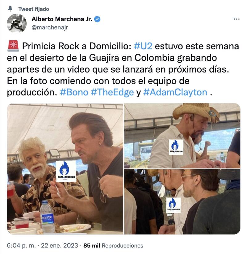 Según lo registró el periodista musical Alberto Marchena Jr., la anda habría llegado al país para grabar uno de sus temas: "U2 estuvo este semana en el desierto de La Guajira, en Colombia, grabando apartes de un video que se lanzará en próximos días. En la foto comiendo con todos el equipo de producción", escribió.