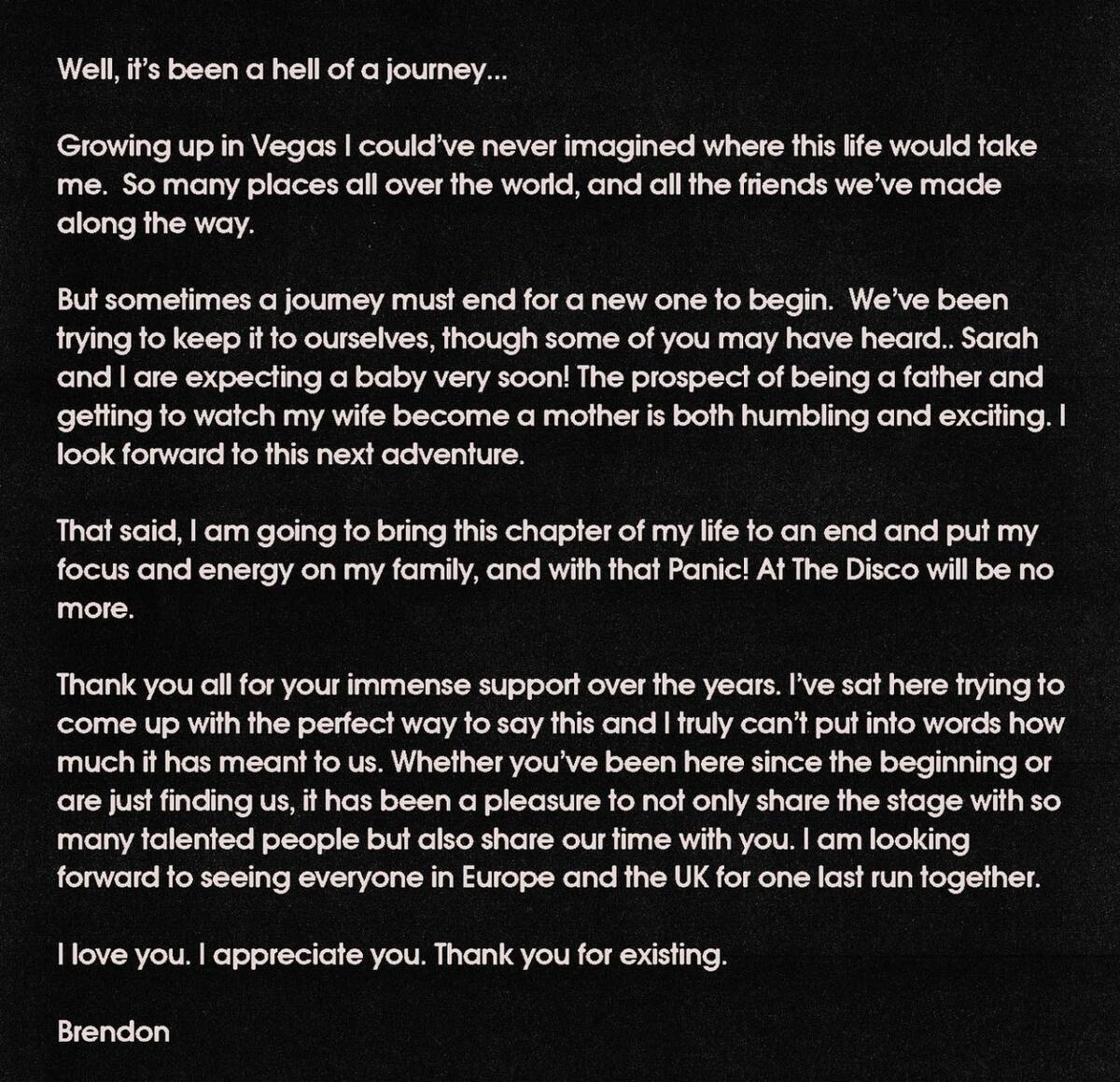 Con eso dicho, quiero cerrar este capítulo de mi vida y poner toda mi atención y energía en mi familia y con eso Panic! At The Disco ya no existirá.