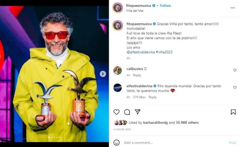 La voz de "Circo beat", vestido de amarillo y verde, reivindicó el rock, relegado en esta edición del Festival de Viña 2023, con una presentación que nunca bajó el pie del acelerador. Las Gaviotas de Plata y Oro nunca estuvieron en duda y la respuesta del público de la Quinta Vergara, con el que lleva una larga comunión, le fijó un nuevo desafío: conquistar la Gaviota de Platino, que fue otorgada por cuarta vez en la historia del evento, el pasado martes, a Los Jaivas, la agrupación más importante de Chile, que está celebrando seis décadas de trayectoria.