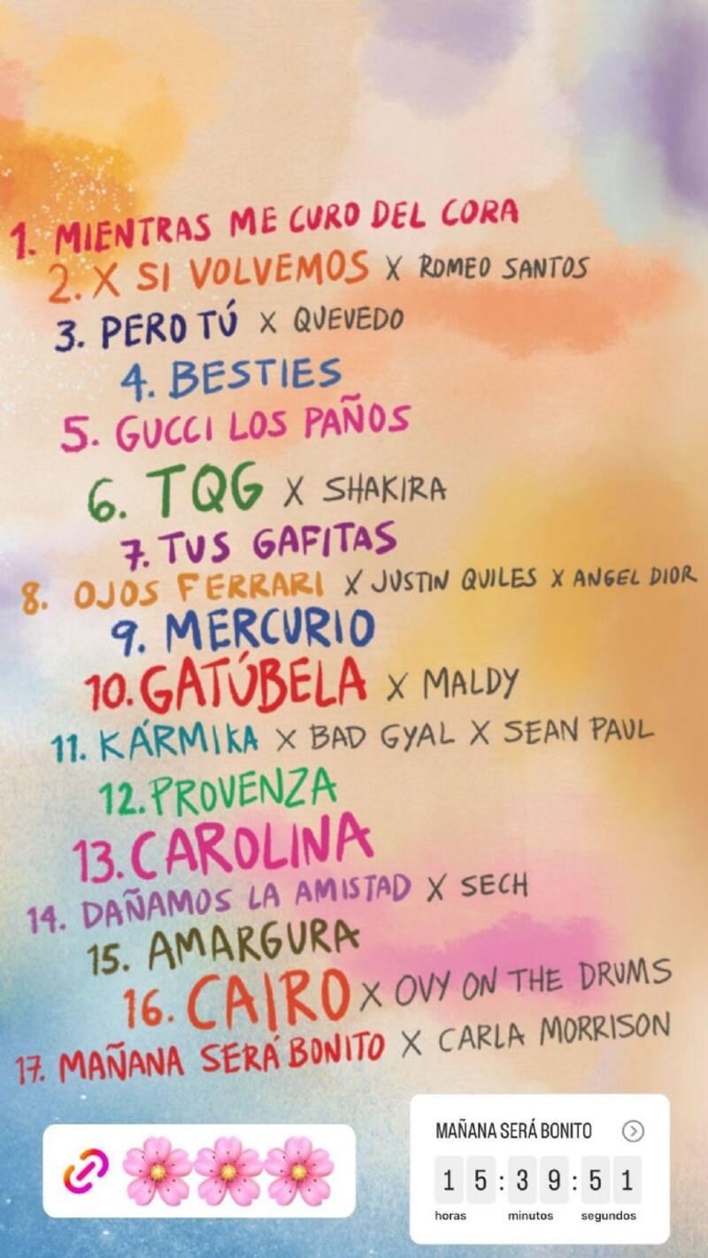 Ahora, entre los temas lanzados en la noche de este 24 de febrero es "Mientras me curo el cora", una de las canciones del disco, que también ha dado mucho de qué hablar porque es una canción sensible, empática que nos habla sobre la depresión y la recuperación del alma: "Dame tiempo que no estoy en mi mejor momento, pero sé que mañana será más hermosa, diferente, otra cosa, otro ambiente", reza parte de la canción.