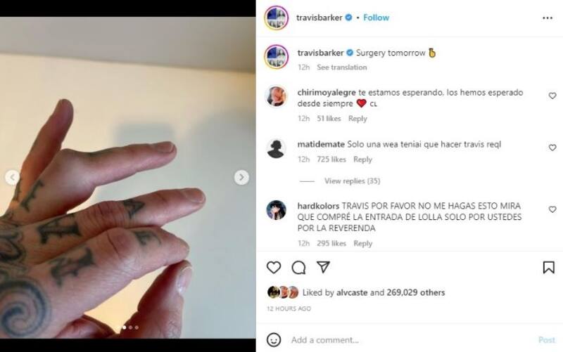 No esta claro si es el mismo dedo o si el baterista se lastimó otro, pero lo concreto es que Travis Barker puso aún más incertidumbre la presentación de Blink-182 en los Lollapalooza Chile, Argentina y Brasil, como en el resto de su gira por Sudamérica, ya que subió un video anunciando que se someterá a una cirugía este martes 28 de febrero, a tan solo 11 días del primer concierto de su tour mundial.