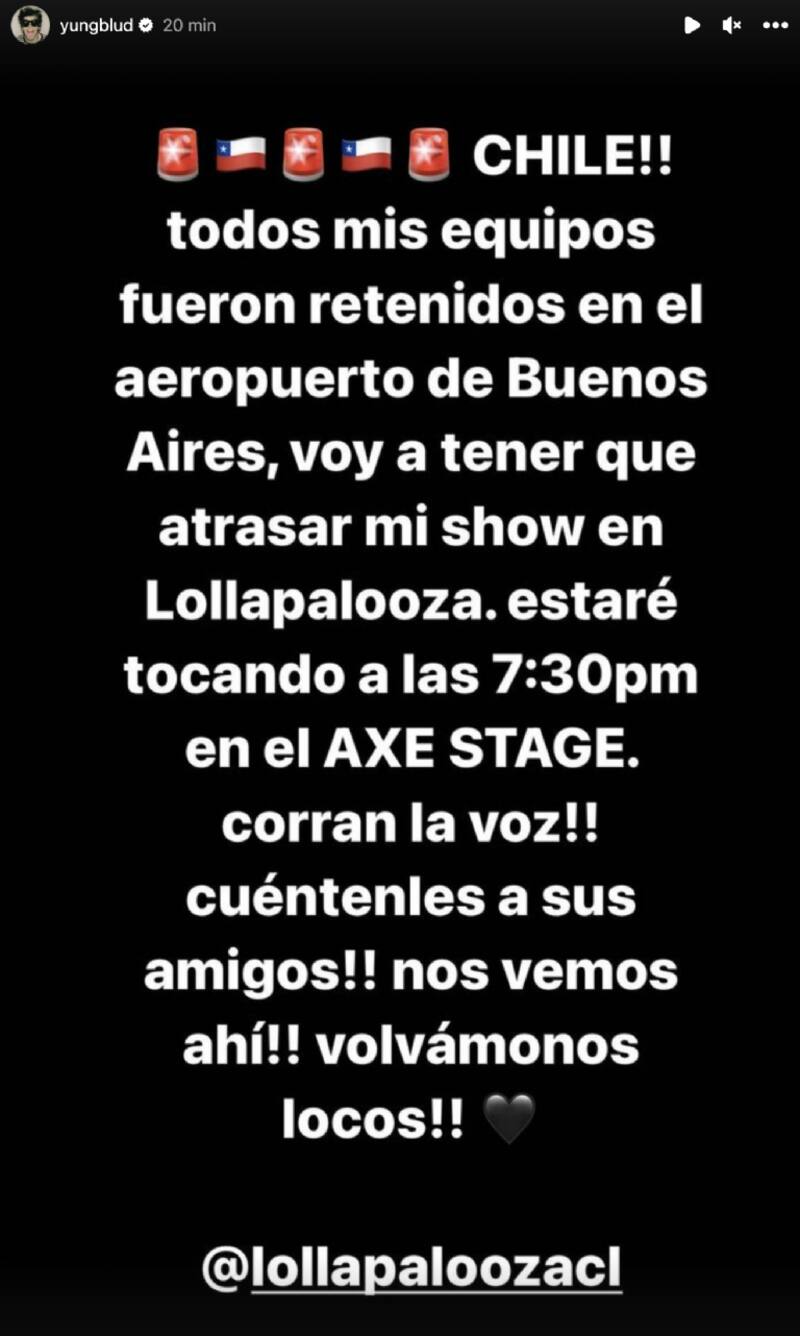 El cantante británico YungBlud fue uno de los afectados. A través de sus historias de Instagram, el intérprete comunicó: "Chile, todos mis equipos fueron retenidos en el aeropuerto de Buenos Aires".
