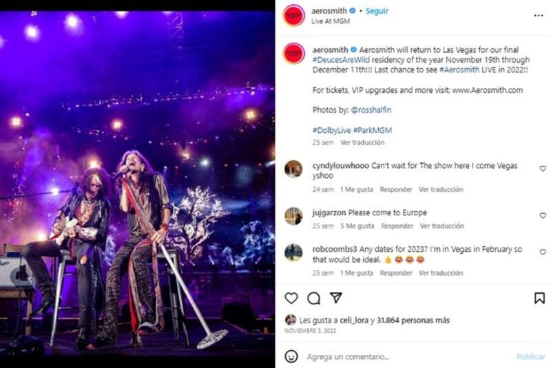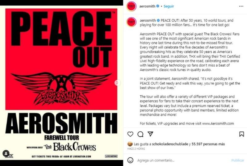 "¡No es un adiós, es PAZ!" Los compañeros de banda Steven Tyler, Joe Perry, Tom Hamilton y Brad Whitford agregaron en un comunicado conjunto. "Prepárate y camina de esta manera, vas a tener el mejor espectáculo de nuestras vidas".