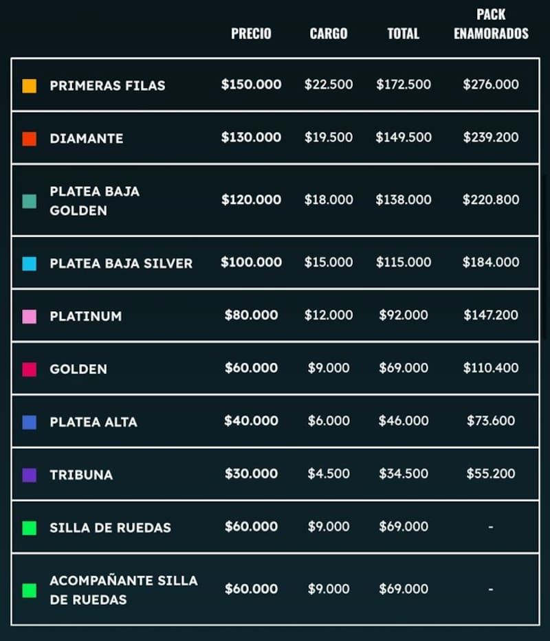 Sobre la venta de entradas, estarán disponibles este jueves 12 de febrero por PuntoTicket desde las 11:00 am y los precios varían para un solo espectador entre los $34.500 y $172.500, y para los enamorados hay packs para dos personas que van desde los $55.200 y los $276.000.