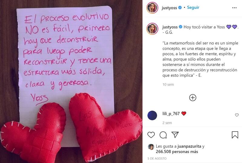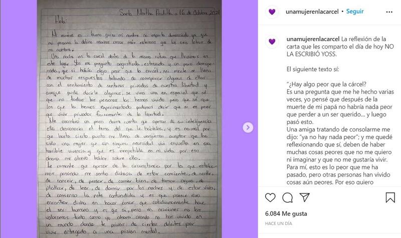 La primera carta posteada fue escrita por una de las reclusas, cuya identidad fue resguardada. Al pie de la imagen, YosStop reflexionó diciendo "¿Hay algo peor que la cárcel?... Es una pregunta que me he hecho varias veces, yo pensé que después de la muerte de mi papá no habría nada peor que perder a un ser querido… y luego pasó esto".
