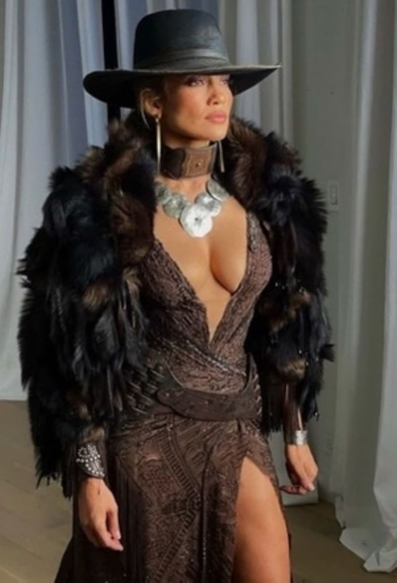 La ultima vez que vimos a la novia de Ben Affleck siendo una cowboy girl muy sexy fue en la MET Gala 2021, donde uso un espectacular vestido de Ralph Lauren en color café, un bolero de dos tonos fabricado con plumas sintéticas y un sombrero de vaquera.