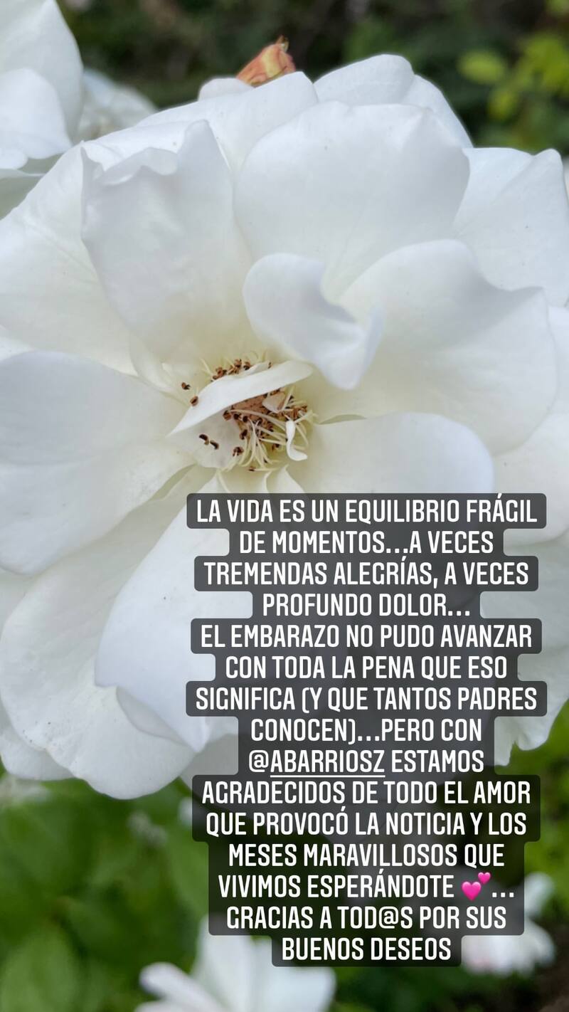 Con esas palabras la comunicadora informó en sus historias de Instagram la triste noticia de la pérdida del embarazo. "La vida es un equilibrio frágil de momentos… a veces tremendas alegrías, a veces profundo dolor" y prosiguió "el embarazo no pudo avanzar con toda la pena que eso significa (y que tantos padres conocen)", escribió.