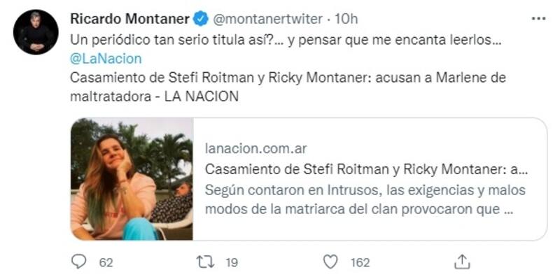 Esto generó que Ricardo Montaner reaccionara en sus redes sociales. El cantante ocupó su cuenta de Twitter para criticar el artículo del medio escrito argentino.