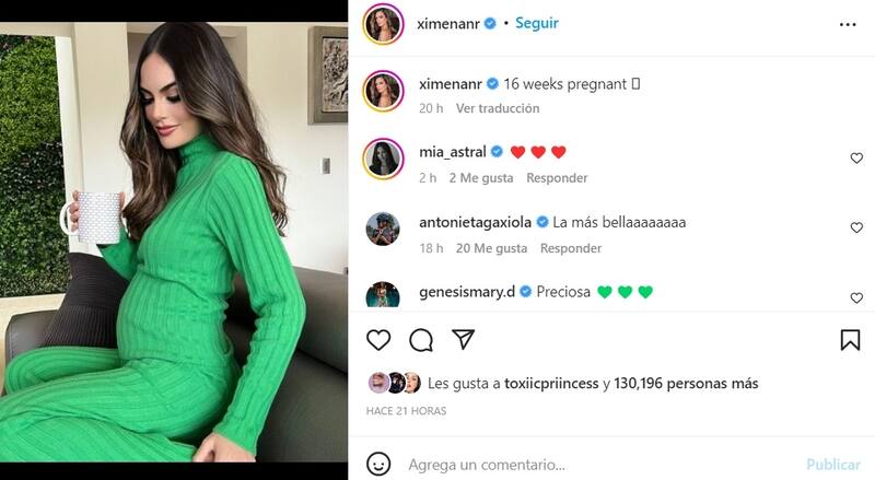 En dicha imagen Ximena Navarrete posó de lo más tierna en un conjunto de punto color verde un poco ajustado, lo que evidenciaba la pancita de embarazo, que, a pesar de estar pequeña, cada día se hace más evidente. "16 semanas de embarazo", escribió Navarrete al pie de su publicación, dejando en claro que su embarazo se encuentra en la primera etapa.