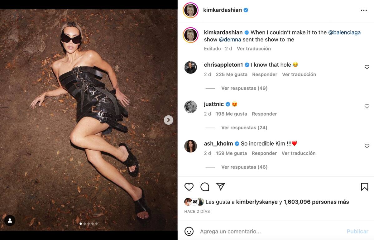 La empresaria compartió una serie de fotografías en las que se le ve con un atuendo hecho de cinturones y con unas enormes gafas. "Cuando no pude ir al show de Balanceada, Demna me mandó el show a mí", escribió Kim Kardashian quien cumplió con la temática.