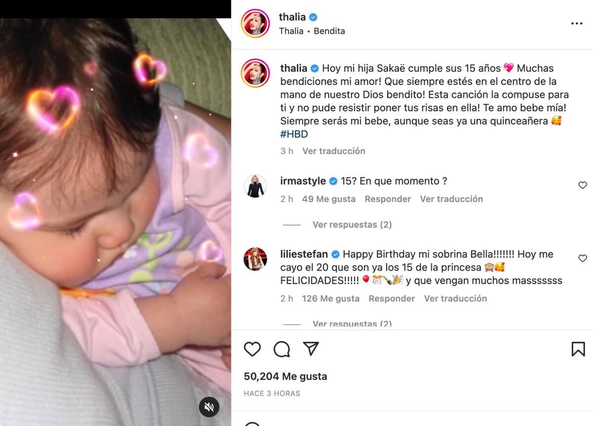 "Muchas bendiciones mi amor. Que siempre estés en el centro de la mano de nuestro Dios bendito", fueron algunas de las palabras que Thalía escribió en su publicación. El post en poco tiempo alcanzó más de 50 mil likes y miles más de comentarios de felicitaciones.