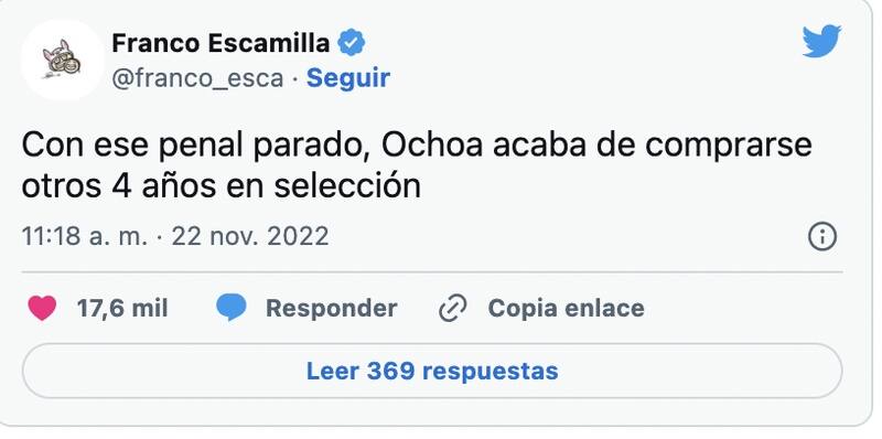 Pero no todos fueron comentarios positivos, pues algunos usuarios externaron su inconformidad con el penal porque consideraron que Robert Lewandowski lo lanzó con muy poca potencia y por esa razón habría sido fácil que el mexicano lo detuviera. Tal fue el caso de Chumel Torres, quien solo escribió: "Penal Culero".