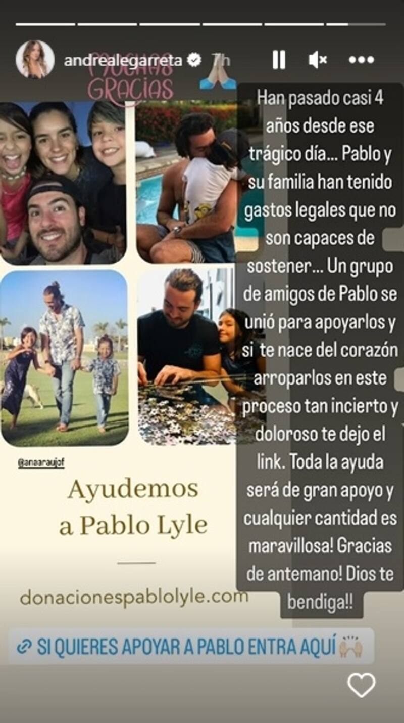 Por ello, no extraña que este realizando una campaña para ayudar a Pablo Lyle y su familia. La presentadora de televisión compartió en sus historias de Instagram una serie de fotos del actor con su familia con el mensaje "Ayudemos a Pablo Lyle".