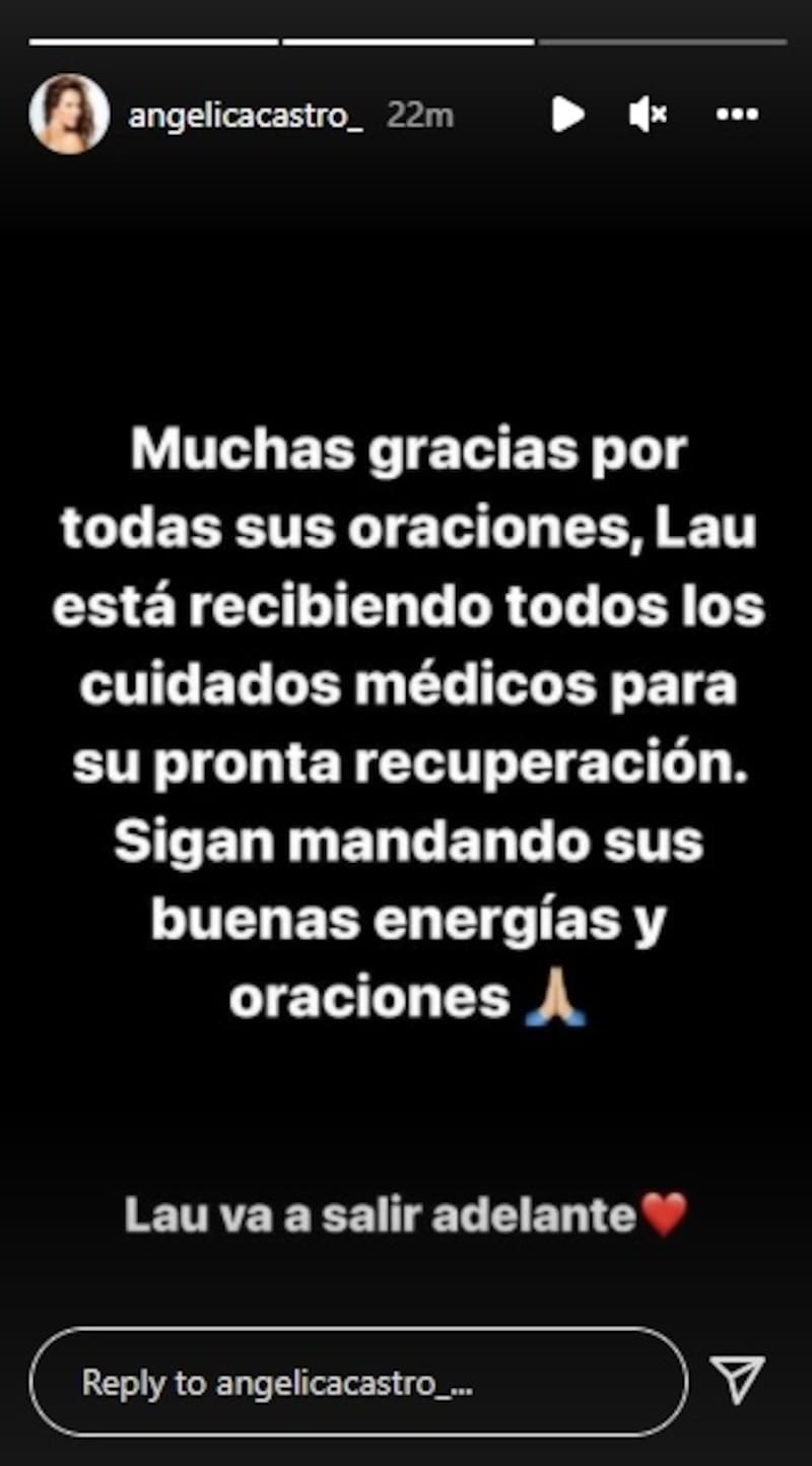 La información la confirmó la esposa de rostro televisivo, Angélica Castro, a través de una historia de Instagram, en la que pidió que rezarán por su hija. Con el pasar de las horas, la comunicadora actualizó la situación de su hija: "Muchas gracias por todas sus oraciones, Lau está recibiendo todos los cuidados médicos para su pronta recuperación. Sigan mandando sus buenas energías y oraciones. Lau va a salir adelante".