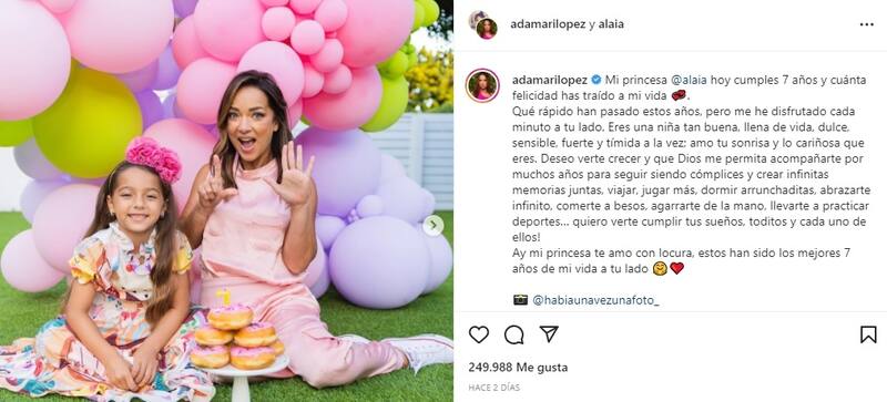En la cuenta de Instagram de su hija, Adamari López expresó toda su felicidad por este nuevo año de vida de Alai¨a. "Mi princesa @alaia hoy cumples 7 años y cuánta felicidad has traído a mi vida", destacó, para luego agregar: "Qué rápido han pasado estos años, pero me he disfrutado cada minuto a tu lado".