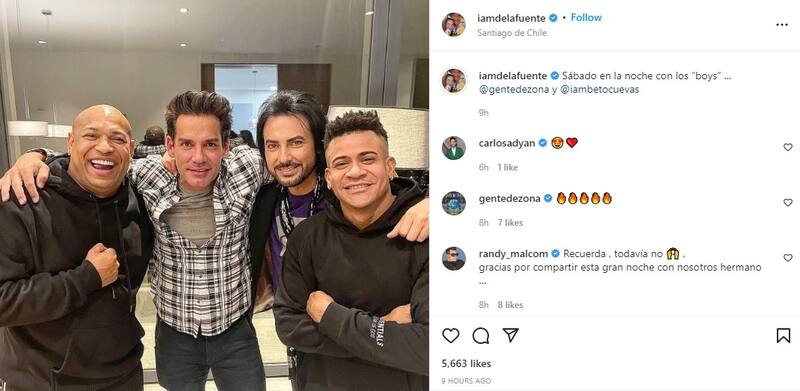 El actor, quien recientemente fue confirmado como anfitrión de los Latin American Music Awards, disfrutó de la compañía de Gente de Zona y Beto Cuevas. "Sábado en la noche con los 'boys'", escribió Cristián de la Fuente en el mensaje de una foto en la que sale posando con los cubanos Alexander Delgado y Randy Malcom, y el cantante chileno.