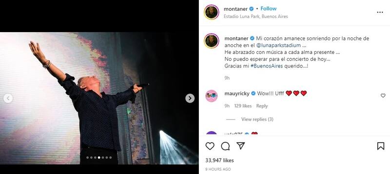 Una serie de conciertos que tienen sus entradas agotadas y que sumó una nueva fecha para septiembre, por lo que Ricardo Montaner es pura emoción. Así lo compartió en su cuenta de Instagram, donde subió varias fotos con el siguiente mensaje: "Mi corazón amanece sonriendo por la noche de anoche en el @lunaparkstadium... He abrazado con música a cada alma presente… No puedo esperar para el concierto de hoy… Gracias mi #BuenosAires querido…!".
