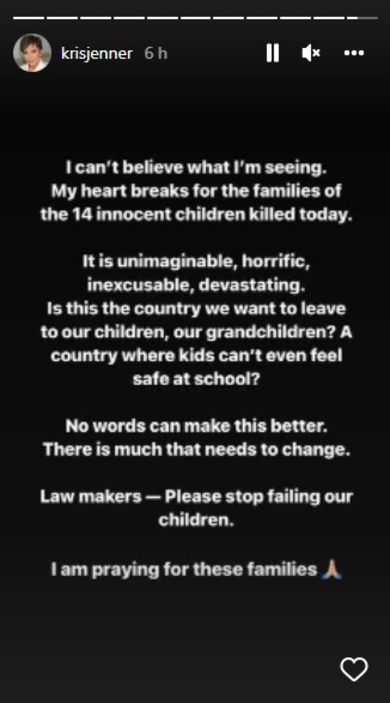 La matriarca del clan Kardashian escribió: "No puedo creer lo que estoy viendo. Mi corazón se rompe por las familias de los 14 niños inocentes asesinados hoy. Es inimaginable, horrible, imperdonable, devastador. ¿Es este el país que queremos dejar a nuestros hijos, a nuestros nietos? ¿Un país donde los niños ni siquiera pueden sentirse seguros en la escuela? No hay palabras que puedan mejorar esto. Hay mucho que necesita cambiar. Legisladores, por favor, dejen de fallarles a los niños. Estoy orando por estas familias".