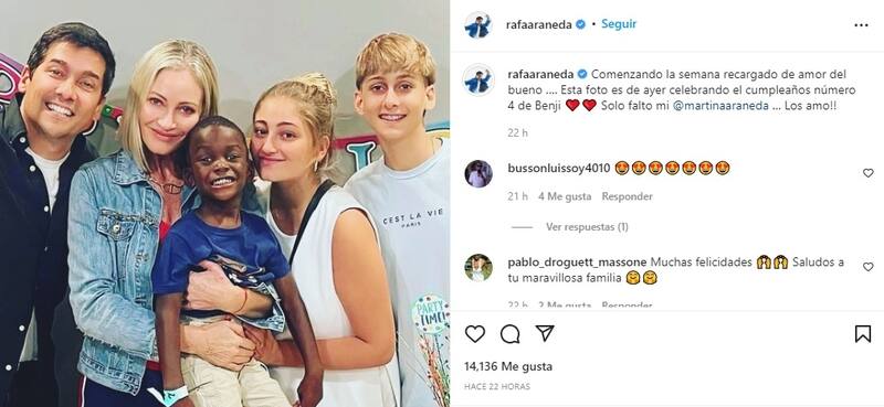 El pasado lunes, el animador chileno compartió una foto familiar con el siguiente mensaje: "Comenzando la semana recargado de amor del bueno… Esta foto es de ayer celebrando el cumpleaños número 4 de Benji. Solo falto mi @martinaaraneda … Los amo!!".