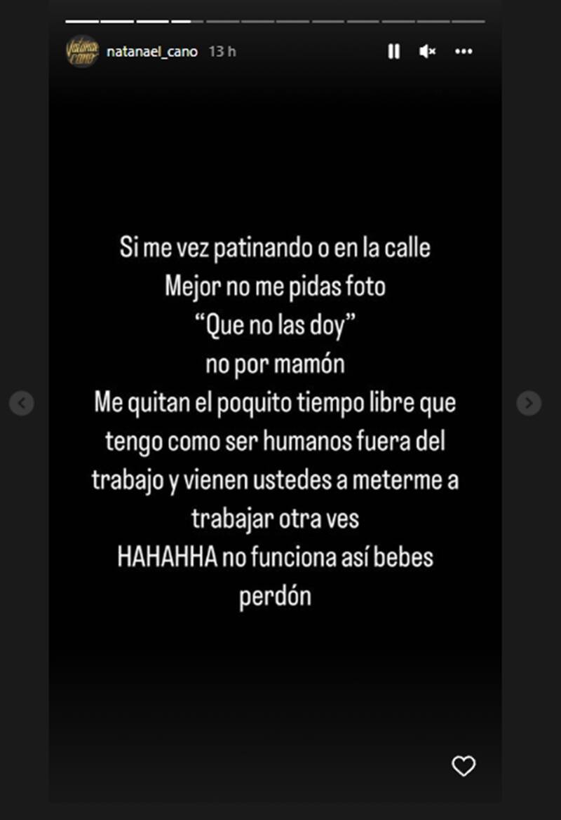 "Si me ves patinando o en la calle, mejor no me pidas foto 'Que no las doy' no por mamón. Me quitaron el poquito tiempo libre que tengo como ser humanos (sic) fuera del trabajo y vienen ustedes a meterme a trabajar otra ves. HAHAHA no funciona así, bebes perdón", se lee en un primer mensaje publicado en sus InstaStories.