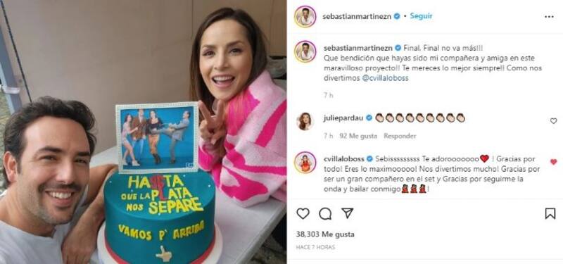 Por ello, en el último día en el que compartían en el set de la telenovela de RCN y Telemundo, Sebastián Martínez le dedicó un tierno mensaje a Carme Villalobos. "¡Final, Final no va más! ¡Qué bendición que hayas sido mi compañera y amiga en este maravilloso proyecto!! Te mereces lo mejor siempre! Cómo nos divertimos", escribió el actor, compartiendo una foto de ambos con una torta temática de "Hasta que la plata nos separe".