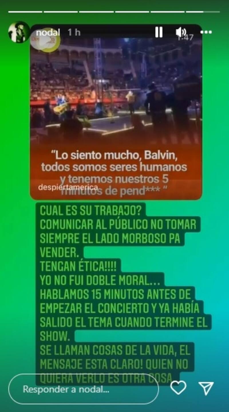 Fue ese el video que recogió un matutino y que fue compartido en sus redes sociales, generando la reacción del mexicano, ya que acusó que lo tildaron de doble moral. Christian Nodal dio a entender que con J Balvin "hablamos 15 minutos antes de empezar el concierto", lo que habría llevado al artista a pedirle disculpas. El asunto es que mientras el cantaba en Morelia, el tema salió.