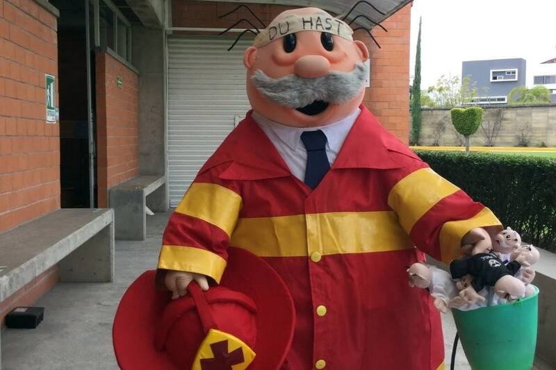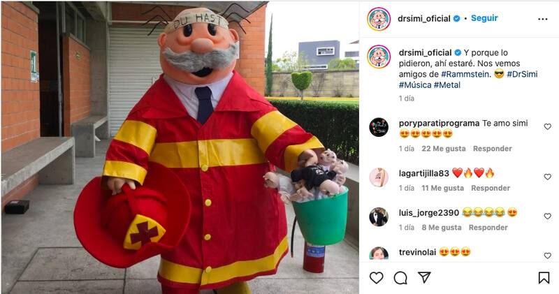 En la publicación del Dr. Simi, la conocida botarga apareció con un traje de bombero y un extintor a un lado, probablemente aludiendo al uso de pirotecnia por la banda liderada por Till Lindemman, quien incluso tiene certificación en el uso de pirotecnia.