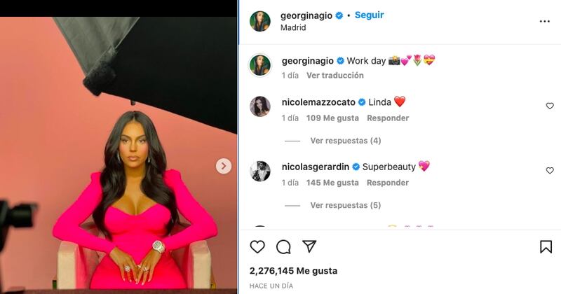 En tanto, Georgina volvió a posar en una sesión fotográfica en la que lució un entallado vestido fucsia de escote pronunciado. "Work day" (Día de trabajo) escribió la influencer acompañando el posteo que incluyó tres imágenes.