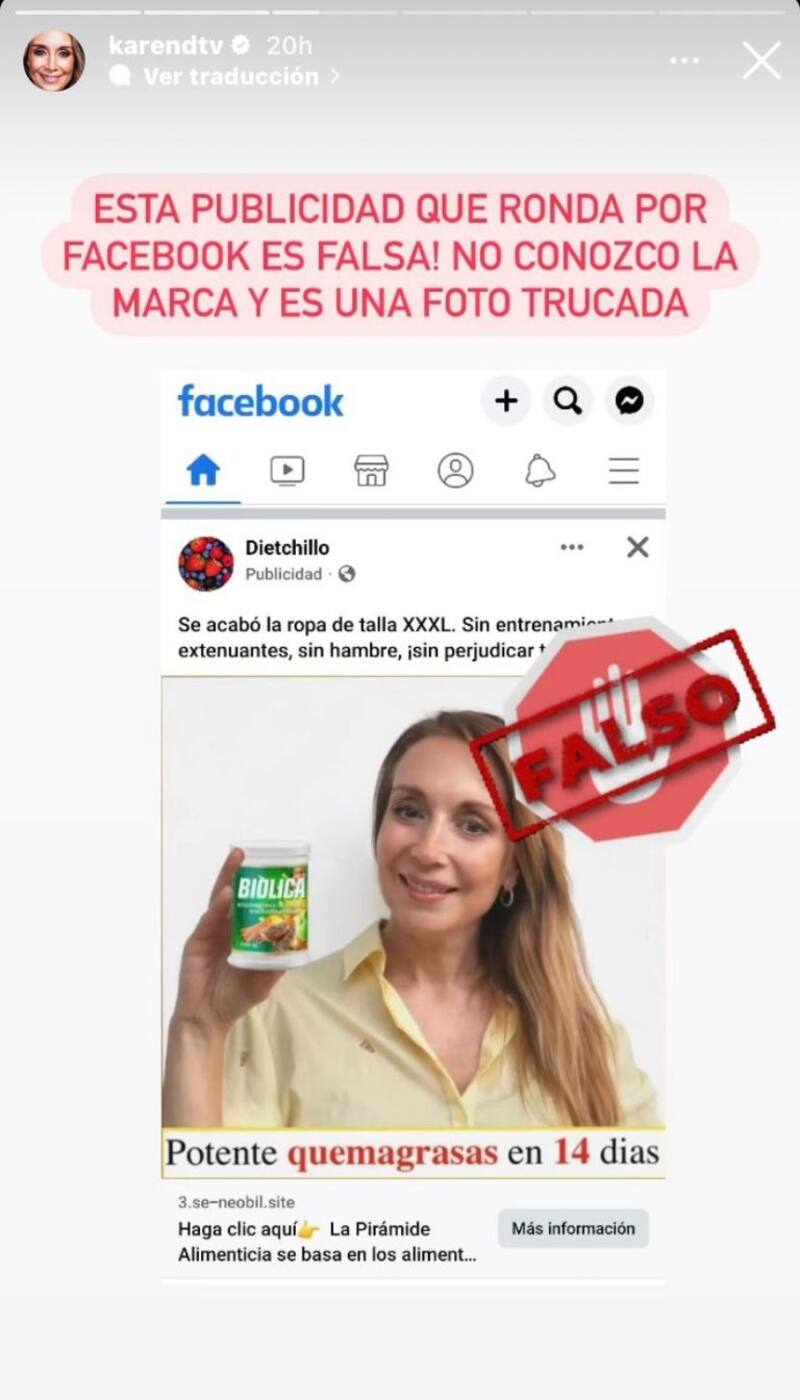 Ahora fue el turno de Karen Doggenweiler de ser parte de este tipo de publicidad engañosa y aunque menos efusiva que la actriz, la comunicadora también recurrió a sus redes sociales a decirle a sus fanáticos que no caigan en este tipo de cosas.