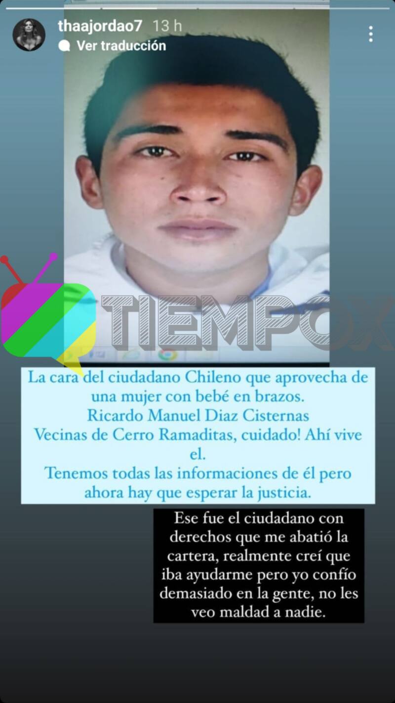 Luego de ya pasado casi un mes del peligroso momento, la modelo volvió a tocar el tema y dio a conocer una foto del malhechor. "La cara del ciudadano chileno que se aprovecha de una mujer con su bebé en sus brazos. Vecinas de Cerro Ramaditas cuidado, ahí vive él. Tenemos toda la información de él pero ahora hay que esperar a la justicia", expresó.