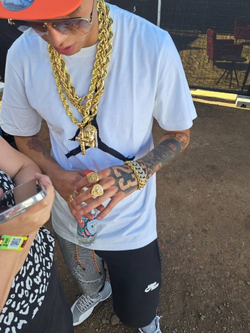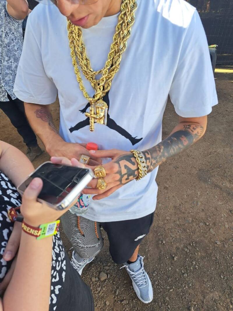 "Todo lo que visto es de Jordan, como siempre, las calcetas son Nike. Las cadenas son todas de oro, tengo estos anillos, todos de oro", dijo el cantante, mientras exhibía un colgante de cruz y otro de la cabeza de Cristo con la corona de espinas.