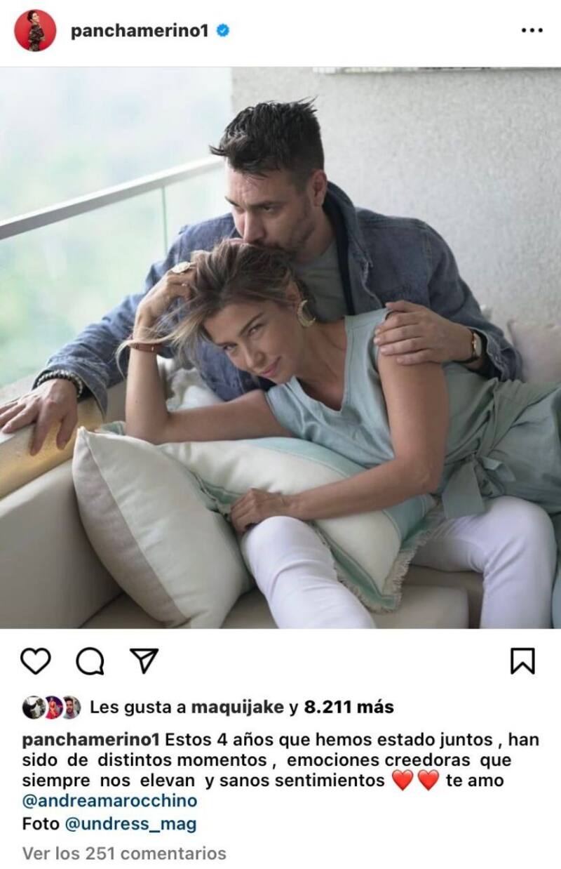 Pancha Merino y Andrea Marocchino son unas de las parejas más estables de la televisión chilena, incluso el día de hoy están cumpliendo 4 años de estar juntos. Por ello, es que la comunicadora se dirigió a sus redes sociales para dedicarle un sentido mensaje a su amado.