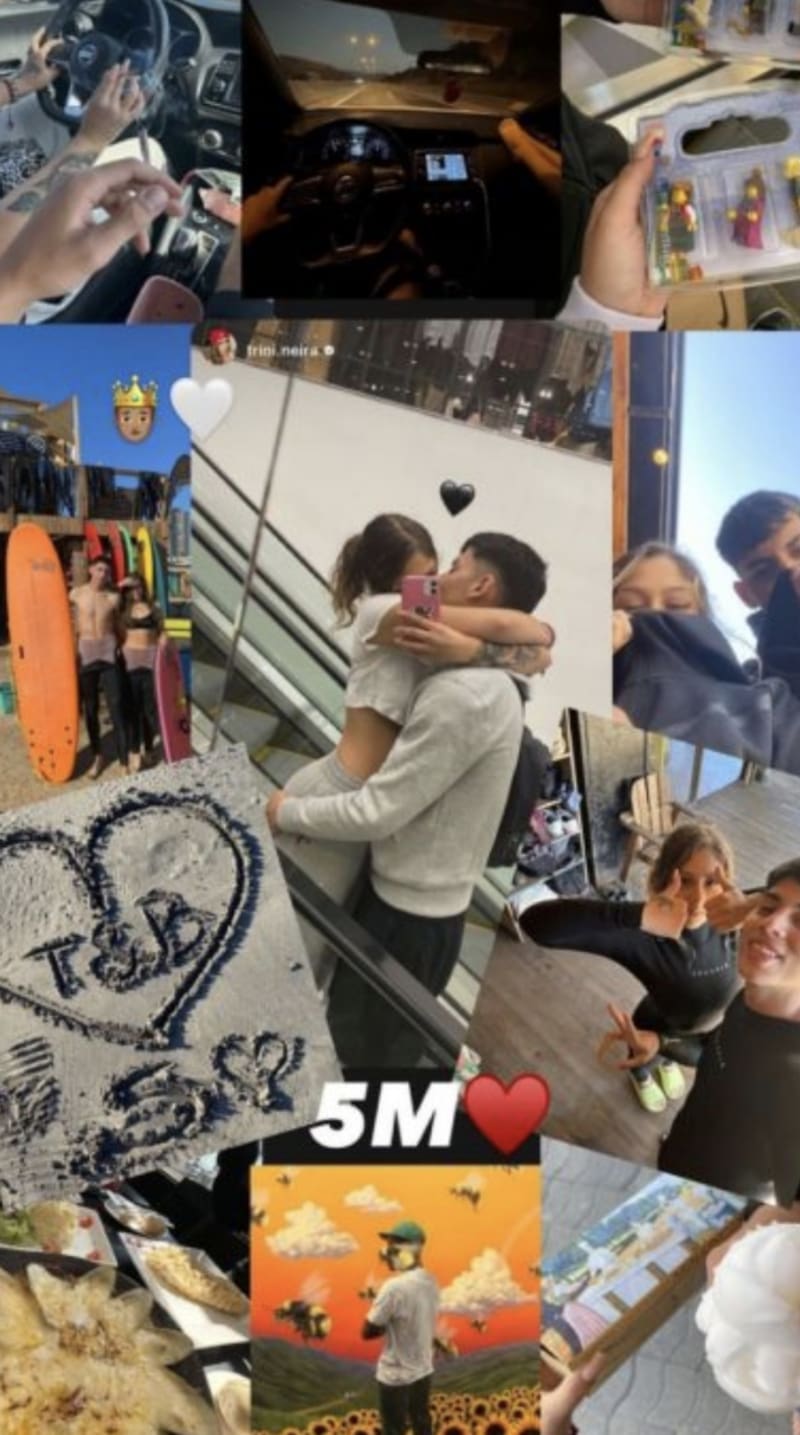 "Cinco meses", expresó Trinidad Neira en sus historias de Instagram, junto a un collage de fotografías de ambos, donde se les puede ver paseando en vehículo, preparándose para surfear y visitando distintos lugares.