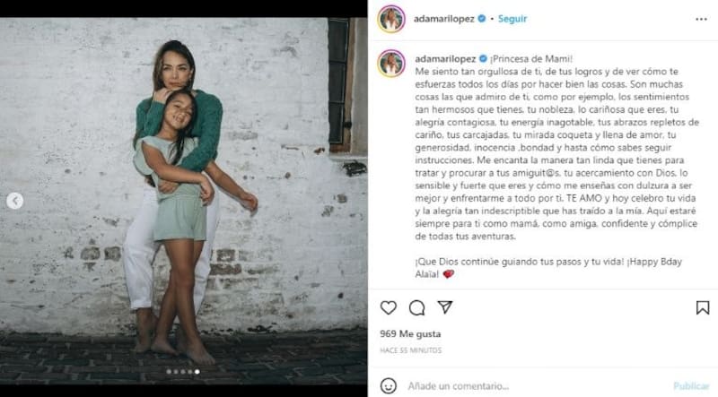 Adamari López destacó que le encanta "la manera tan linda" que tiene Alaïa "para tratar y procurar a tus amiguit@s, tu acercamiento con Dios, lo sensible y fuerte que eres y cómo me enseñas con dulzura a ser mejor y enfrentarme a todo por ti" y, por ello, "hoy celebro tu vida y la alegría tan indescriptible que has traído a la mía".
