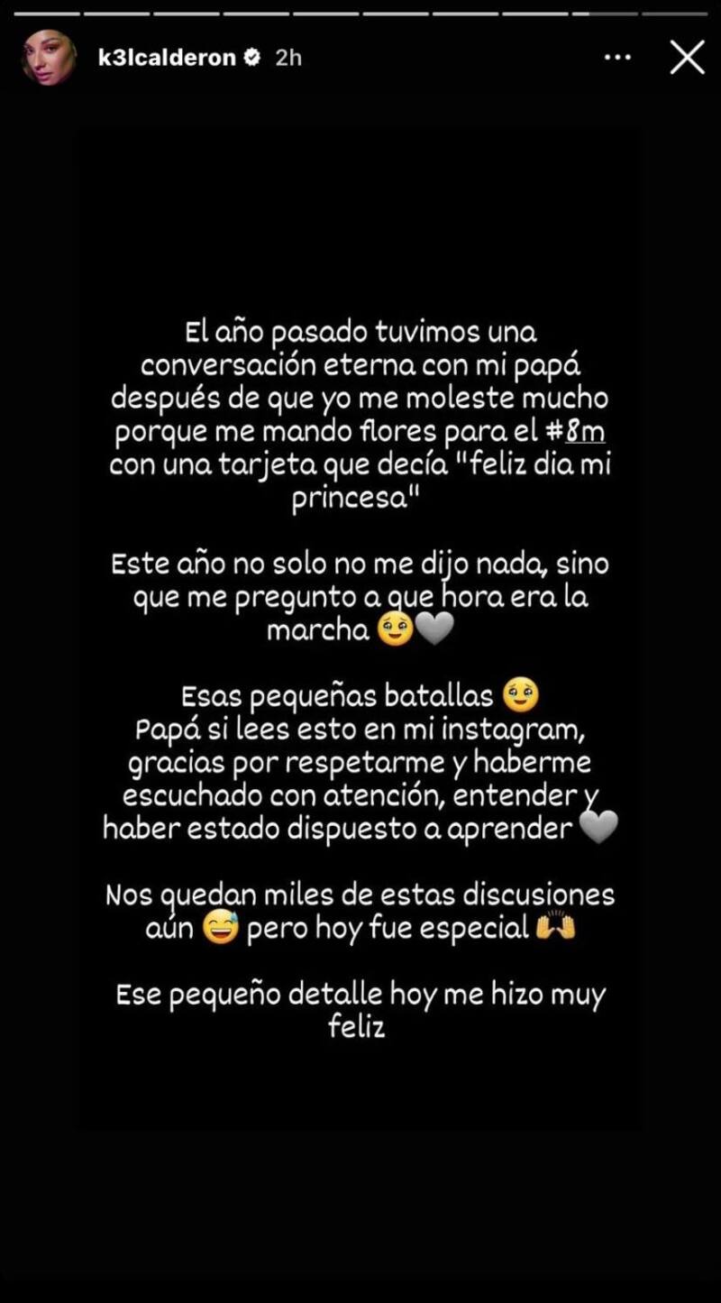Kel Calderón suele ser bastante rígida en sus ideales y suele decir lo que piensa tal y como ella cree que es, incluso con sus padres, a quienes le critica constantemente sus decisiones. Por ello, este año se dio el tiempo de agradecer a su padre por haber cambiado su actuar y respetar su visión del 8M.