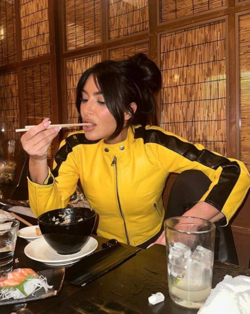 Kim Kardashian asistió al restaurante en honor a Kill Bill vistiendo la icónica chamarra amarilla con franjas negras