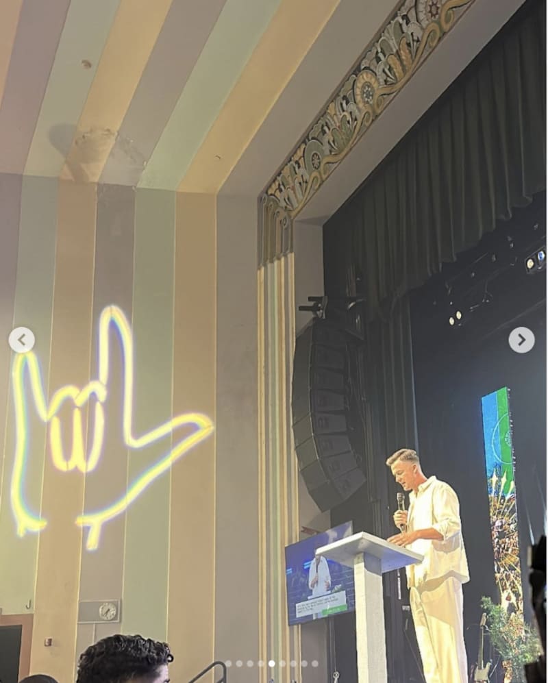En otra de sus fotografías, la actriz mostró a Rich Wilkerson Jr., el pastor de las celebridades, predicando, pero lo que llamó la atención en esta foto es qué hay una seña que se ha tachado de satánica.