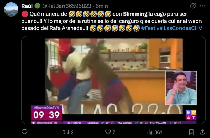 Uno de los puntos más divertidos fue la mención a Rafa Araneda y un chascarro con un canguro, el que incluso se recreó en el escenario con el doble oficial del animador. Momento en que en su versión real los usuarios de X pudieron encontrarlo rápidamente.