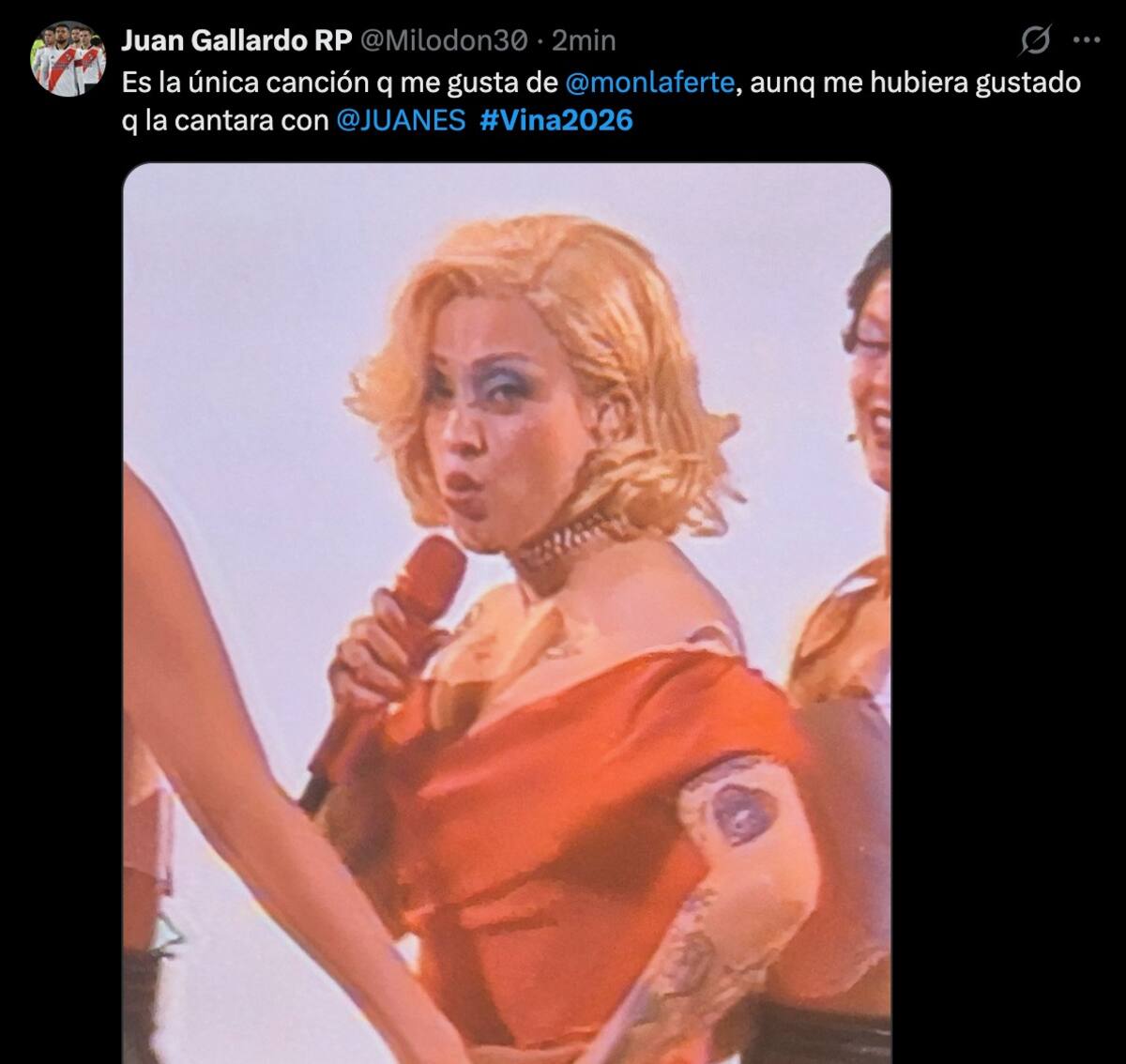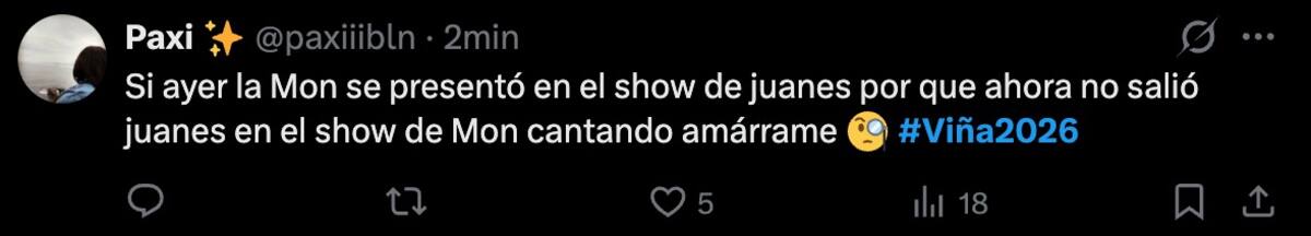 La presentación de Mon Laferte en la Quinta Vergara está siendo uno de los momentos más comentados de la noche de manera positiva, pero también reavivó una polémica que muchos estaban esperando. Y es que el público no se tardó en darse cuenta de que Juanes no interpretó Amárrame junto a la chilena cuando fue su turno sobre el escenario.