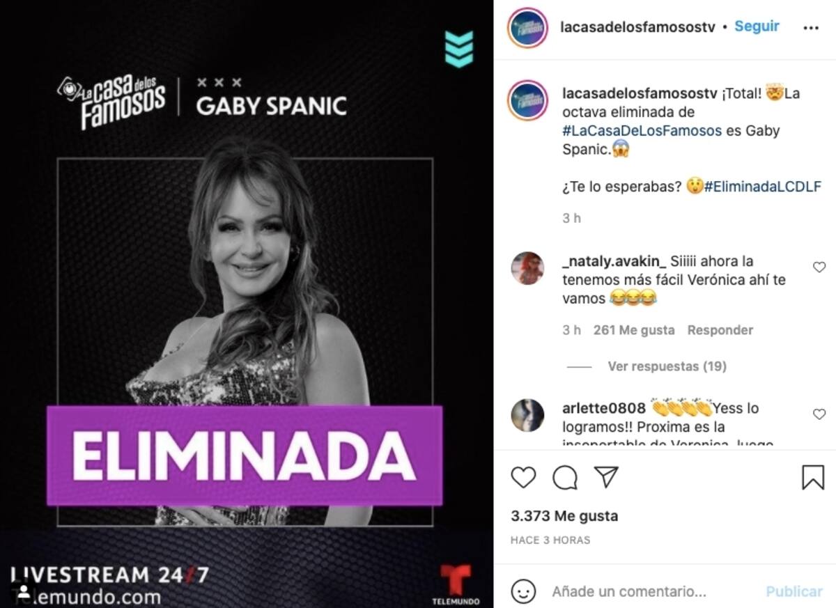 La actriz venezolana Gaby Spanic fue la eliminada de "La casa de los famosos", el reality de Telemundo que se acerca a su final. La actriz de "La usurpadora" recibió la desfavorable votación del público y tuvo que abandonar la casa sorpresivamente. Junto con la peruana Verónica Montes y la también venezolana Alicia Machado había quedado en la terna de eliminación.