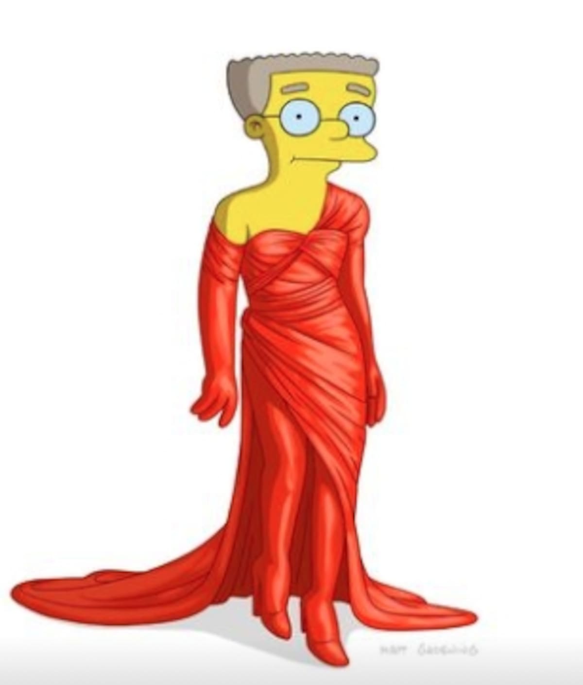 "¿Desfilar en una pasarela? Qué superficial. Bueno, sólo esta vez, por la investigación", dice Lisa Simpson, la aplicada hija del matrimonio Simpson con un vestido rojo de falda de vuelo y su tradicional collar de perlas.