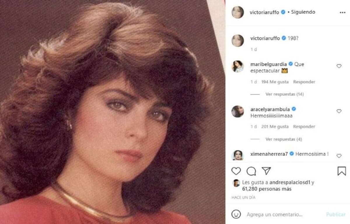 Victoria Ruffo posteó una fotografía en la que presume su belleza con la descripción: “198?”, por lo que varios de sus más fervientes admiradores han respondido que la imagen data del año 1983, por lo que la famosa actriz tendría 21 años. En la instantánea destacan los hermosos ojos de la actriz, así como su tersa piel que luce un maquillaje un poco cargado, tal como se usaba en aquellos años, además del característico peinado con crepé que marcó la década.