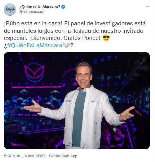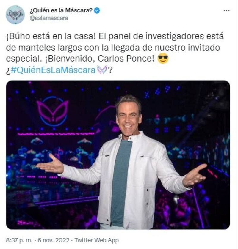 Carlos Ponce regresó este domingo al programa ¿Quién es la Máscara? para integrarse al grupo de investigadores junto a Carlos Rivera, Yuri, Galilea Montijo y JuanPa Zurita.
