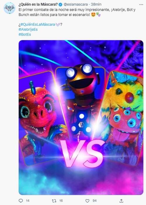 La primera competencia de la noche se disputa entre Alebrije, Bot y Bunch. Los investigadores aseguran que Alebrije es Fany Lu, Flor Amargo, María Antonieta de las Nieves “La Chilindrina”, Kimberly Loaiza o Joy Huerta.