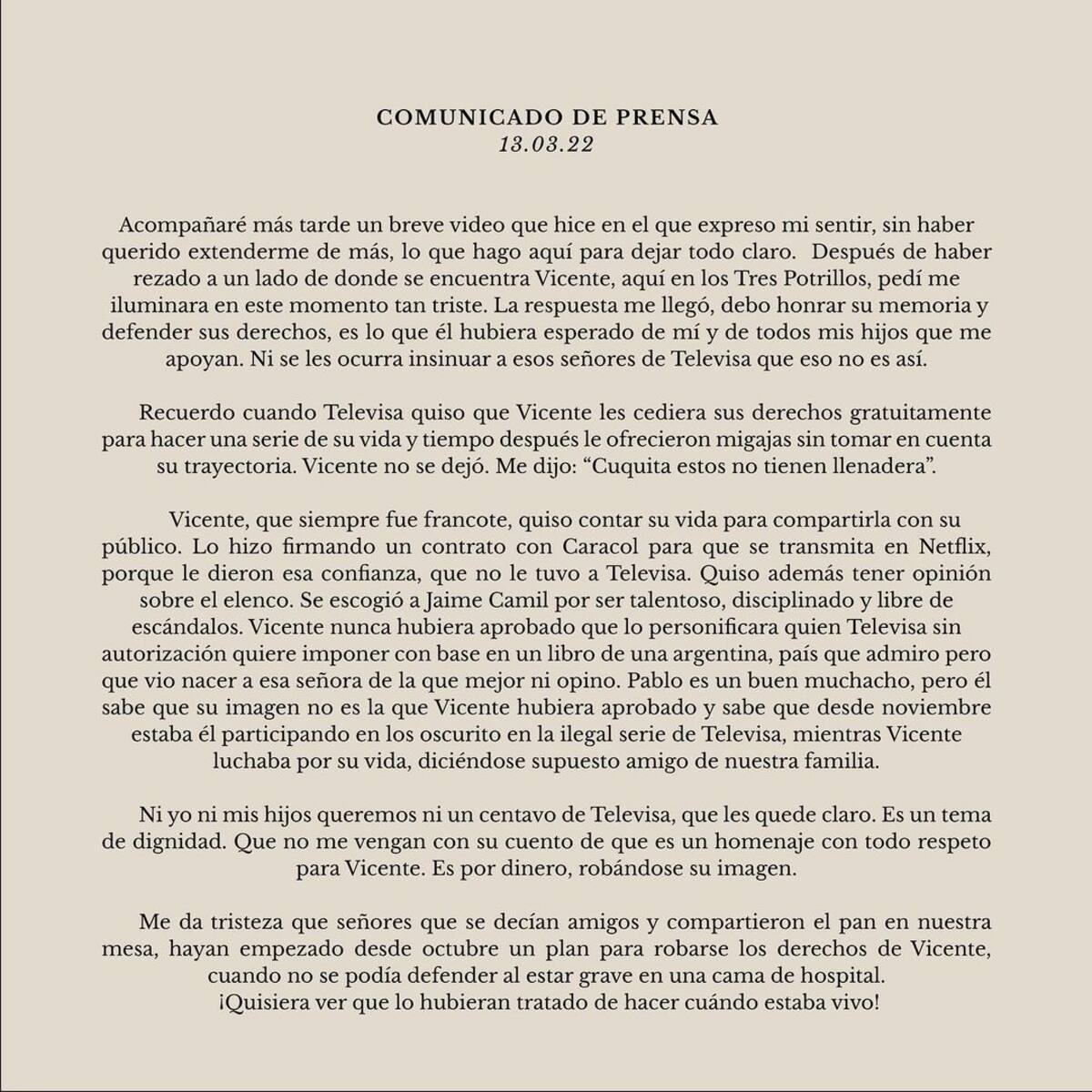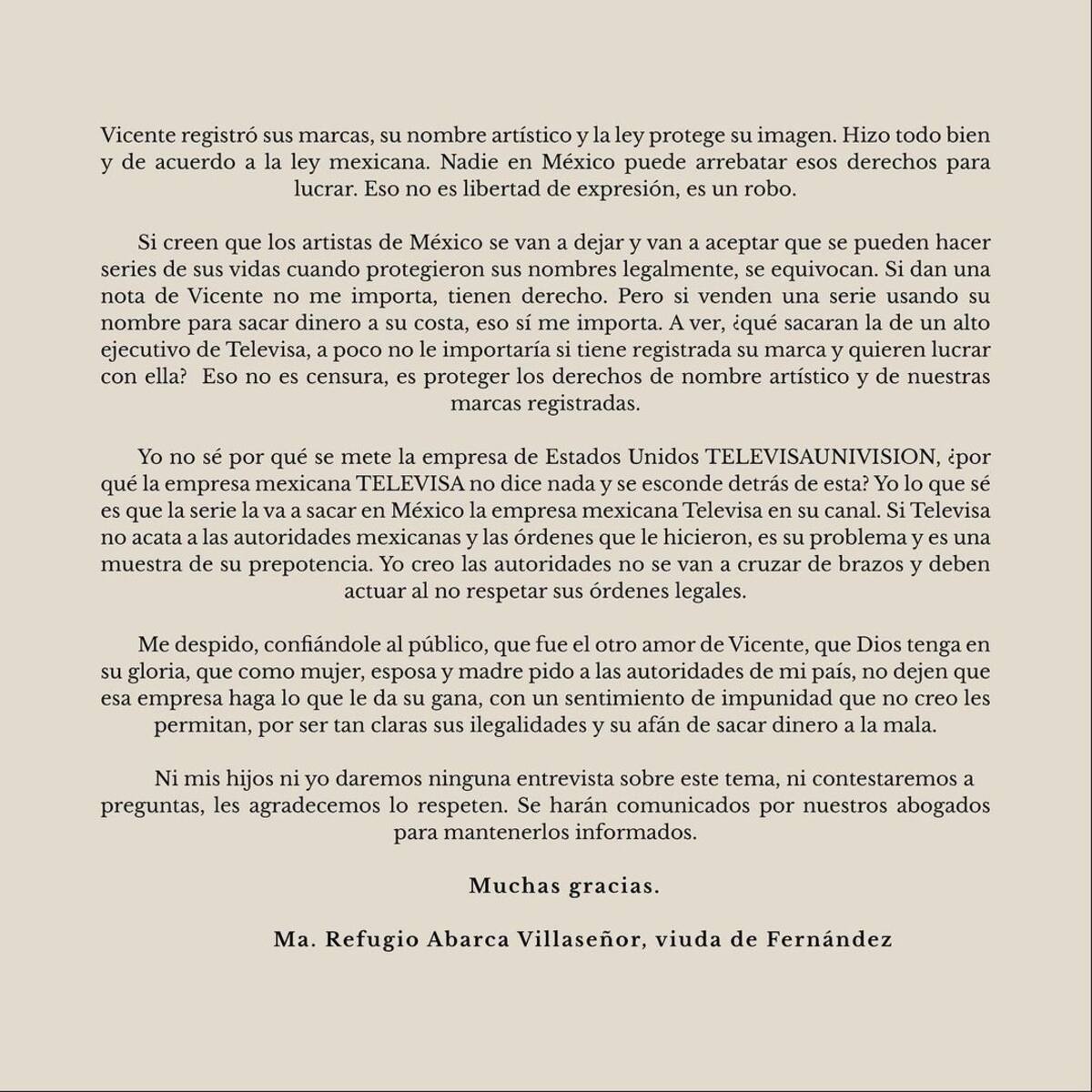 En el comunicado, Doña Cuquita asegura que "ni yo, ni mis hijos queremos ni un centavo de Televisa, que les quede claro. Es un tema de dignidad. Que no me vengan con su cuenta de que es un homenaje con todo respeto para Vicente. Es por dinero, robándose su imagen".