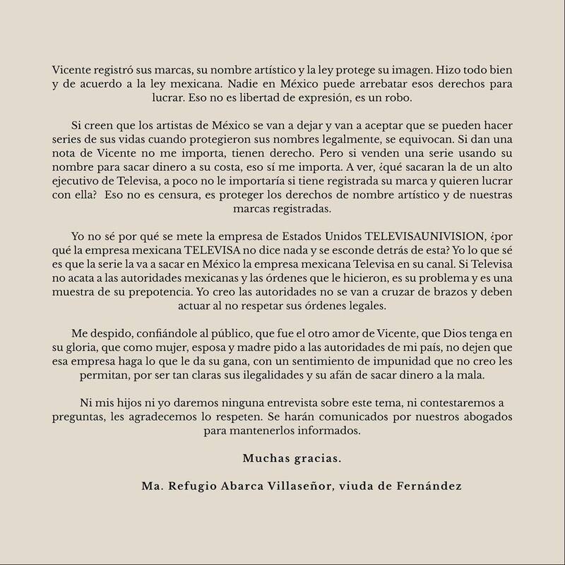 Pero en hora de la tarde noche de este domingo, María del Refugio Abarca, viuda de Vicente Fernández, compartió un comunicado dando su punto de vista sobre el conflicto y la bioserie. "Recuerdo cuando Televisa quiso que Vicente les cediera sus derechos gratuitamente para hacer una serie de su vida y tiempo después le ofrecieron migajas sin tomar en cuenta su trayectoria. Vicente no se dejó. Me dijo: 'Cuquita estos no tienen llenadera'", afirmó.