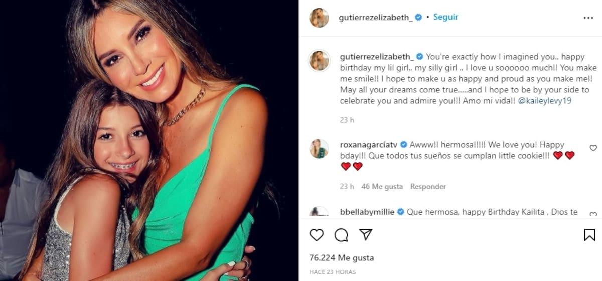 Elizabeth Gutiérrez dedicó historias y una publicación en su red social para celebrar el cumpleaños número 12 de la pequeña. La actriz nacida en EEUU compartió un collage con fotos de ella embarazada esperando a Kailey. También subió dos reels de su hija sonriendo deseándole un feliz cumpleaños.
