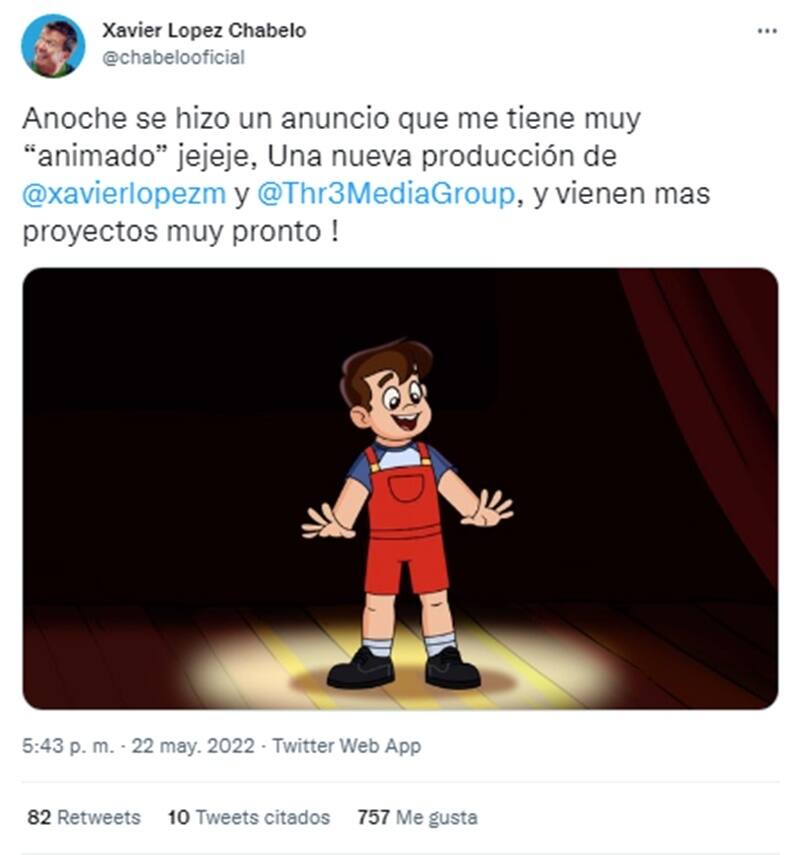 "Anoche se hizo un anuncio que me tiene muy 'animado' jejeje, Una nueva producción de @xavierlopezm y @Thr3MediaGroup, y vienen más proyectos muy pronto", escribió en Twitter el llamado "amigo de todos los niños".